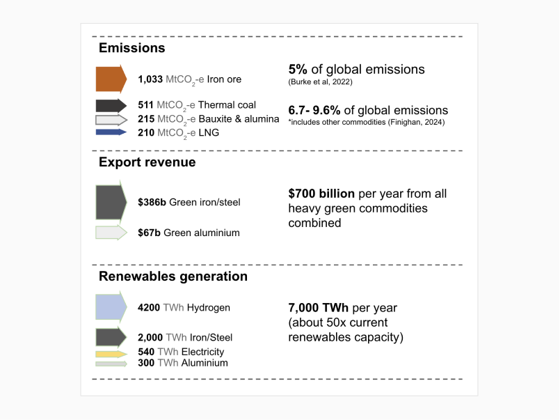 - Value-added exports: Since directly exporting solar and wind energy is inefficient and costly, the opportunity is for Australia to embed renewable energy into value-added products such as green iron, ammonia, and aluminium.