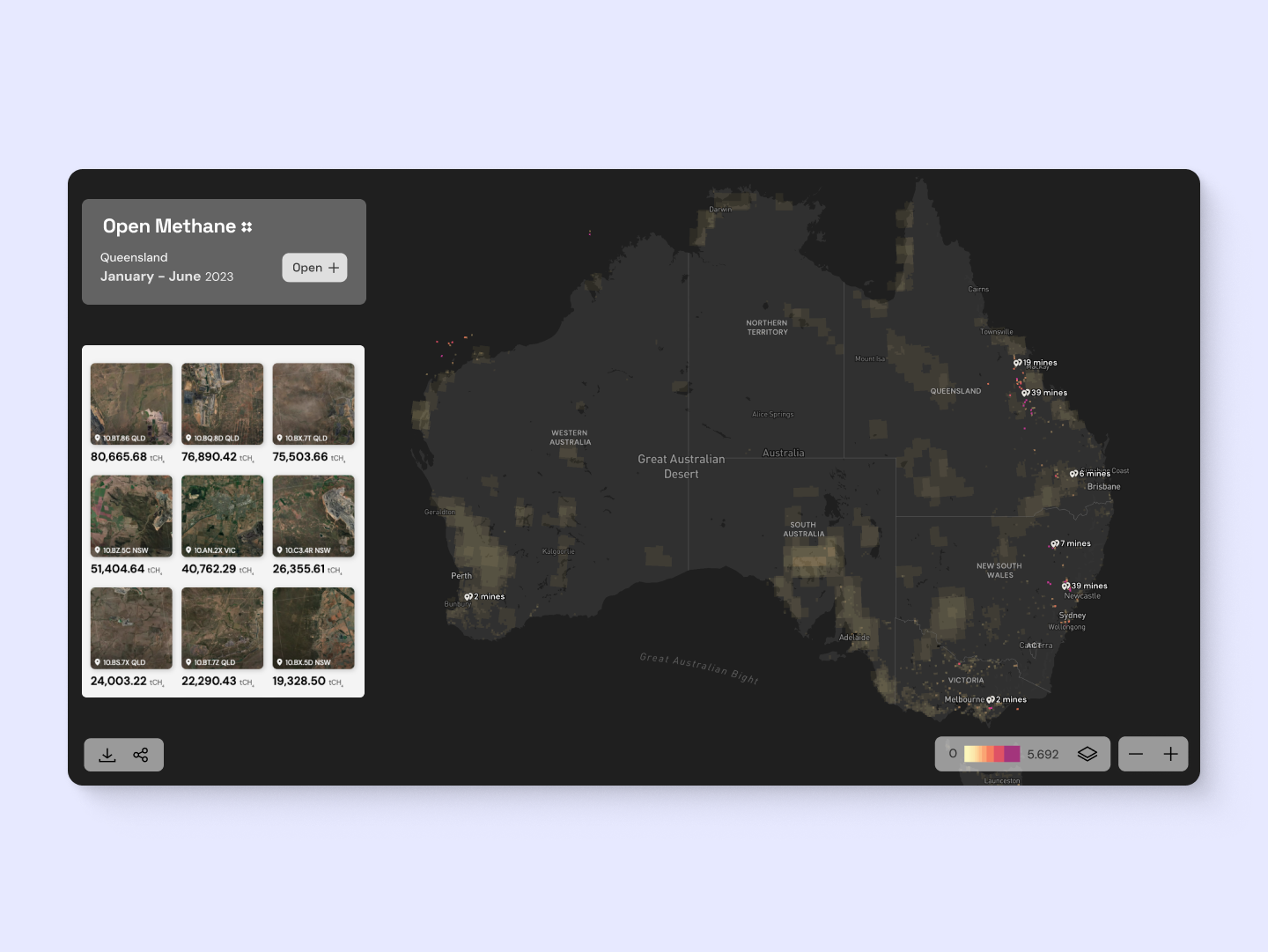 Open Methane is a free, open-source platform for detecting, measuring and locating Australia’s methane emissions. Utilising satellite observations and environmental modelling, it provides an up-to-date, content-scale view of methane emissions across Australia.