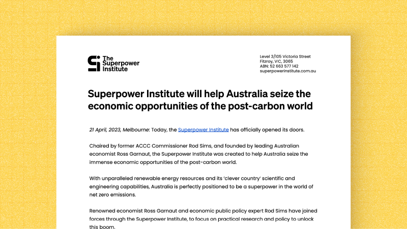 Chaired by former ACCC Commissioner Rod Sims, and founded by leading Australian economist Ross Garnaut, the Superpower Institute was created to help Australia seize the immense economic opportunities of the post-carbon world.