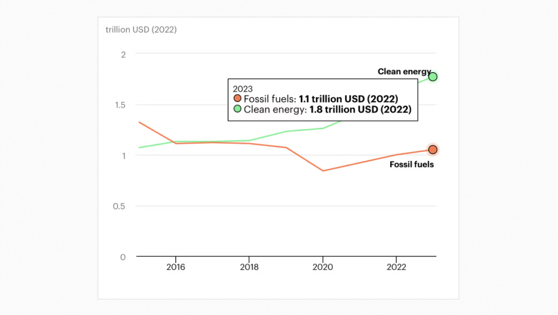 - Annual investment in clean energy has surpassed fossil fuel investments.