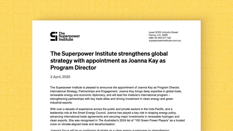 The Superpower Institute is pleased to announce the appointment of Joanna Kay as Program Director, International Strategy, Partnerships and Engagement. Joanna brings deep expertise in global trade, renewable energy and economic diplomacy, and will lead the Institute’s international program – strengthening partnerships with key trade allies and driving investment in clean energy and green industrial exports.