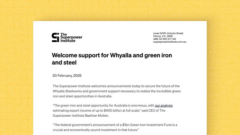 The Superpower Institute welcomes announcements today to secure the future of the Whyalla Steelworks and government support necessary to realise the incredible green iron and steel opportunities in Australia.